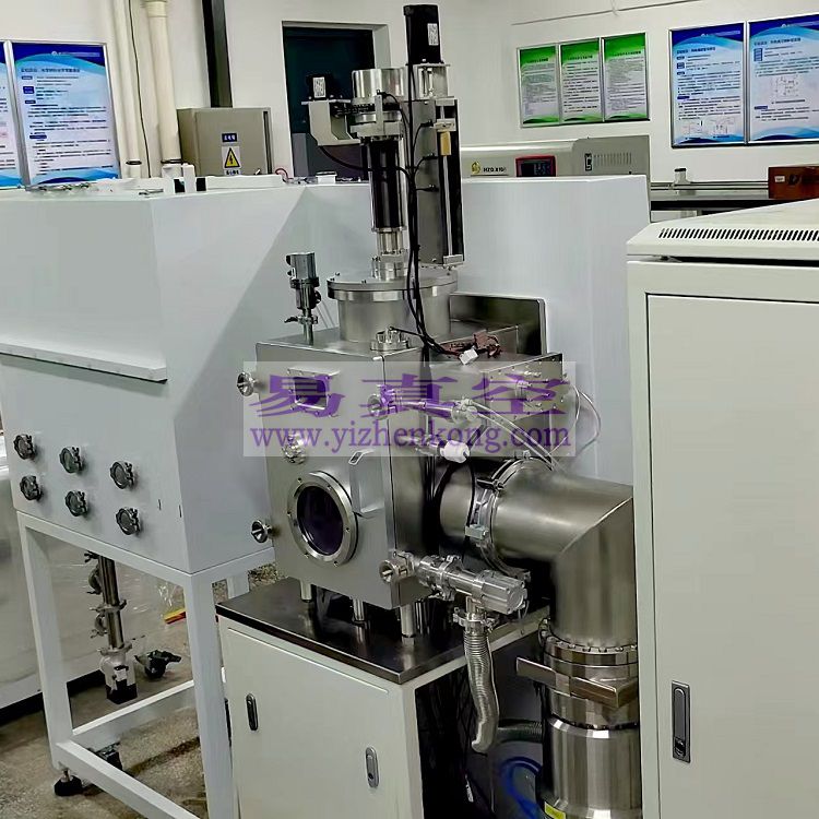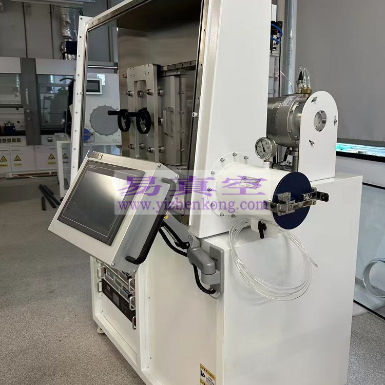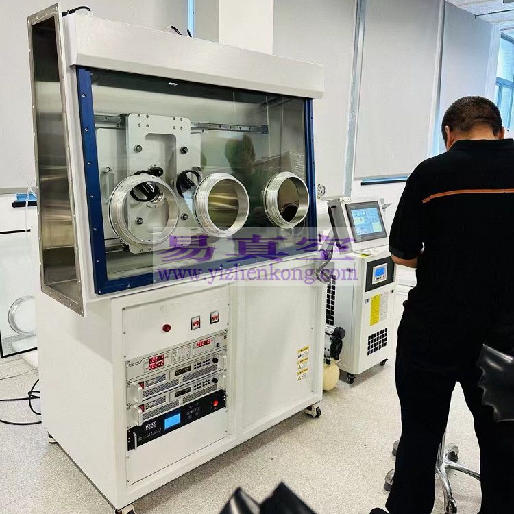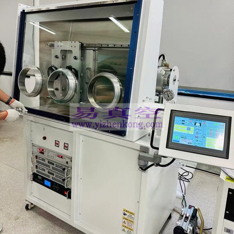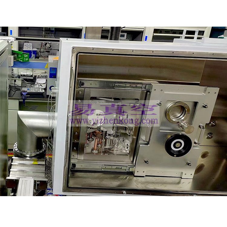 真空腔室:采用立式方形结构,前门为水平滑开式,位于手套箱体内部,前开门便于蒸发材料和样片在保护环境下装卸,后开门便于真空室的清理维护(后门带锁紧装置在充气条件下保持腔室密闭与大气环境隔离),整机位于手套箱体下面,节约占地面积;
