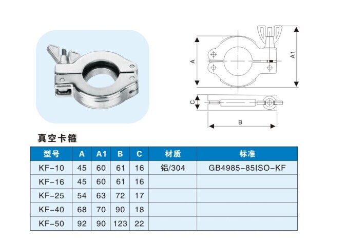 真空卡箍常见的规格为:KF16(KF10)、KF25、KF40、KF50几种规格