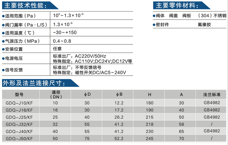 GDQ-J型系列气动高真空挡板阀是用压缩空气为动力,通过电磁换向阀改变气路方向,推动气缸活塞上下运动,带动阀杆上下运动,使阀板开启或关闭,从而达到在真空系统中接通或切断气流的目的。气动高真空挡板阀按轴封结构可分为GDQ-J型橡胶密封和GDQ-J(b)型波纹管密封两种。GDQ-J型为角通型式,GDQ-S型为带预抽口的三通型式。