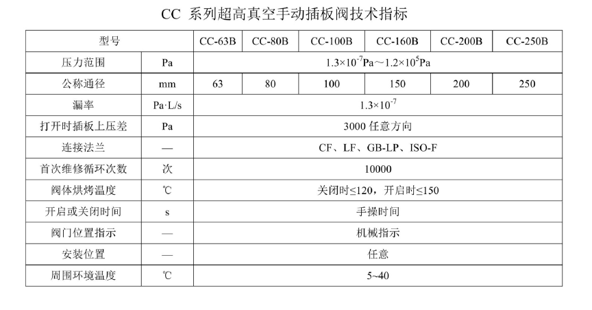 CC型系列超高真空插板阀是通过手轮以螺杆传动,经传动杆推(拉)动连杆机构,驱动阀板沿轴向运动,实现阀门的开启或关闭,从而达到在超高真空系统中接通或切断气流的目的。在结构设计上合理,在外观上美观,并具有动作平稳,体积小,流量大,使用可靠,密封性能好和寿命长等优点,能广泛应用于超高真空设备中。
