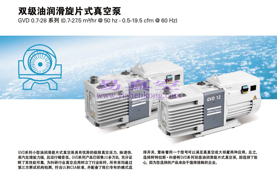 阿特拉斯(Atlas Copco品牌GVD系列油润滑旋片真空泵提供环卓越的极限真空压力,抽送速度快,水蒸气处理能力强,老实巴交行噪音低。该系列目前销量超过20万台,向研发和实验室真空应用领域充分 展示了其久经考验的性能。
