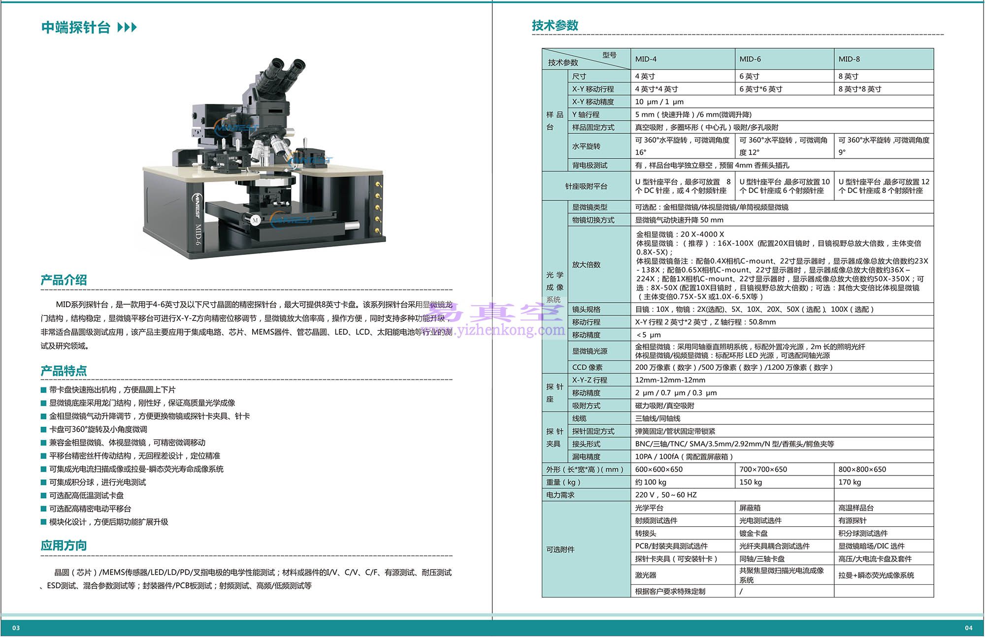 MID系列探针台,是一款用于4-6英寸及以下尺寸晶圆的精密探针台,最大可提供8英寸卡盘。该系列探针台采用显微镜龙门结构,结构稳定,显微镜平移台可进行X-Y-Z方向精密位移调节,显微镜放大倍率高,操作方便,同时支持多种功能升级,非常适合晶圆级测试应用,该产品主要应用于集成电路、芯片、MEMS器件、管芯晶圆、LED、LCD、太阳能电池等行业的测试及研究领域。