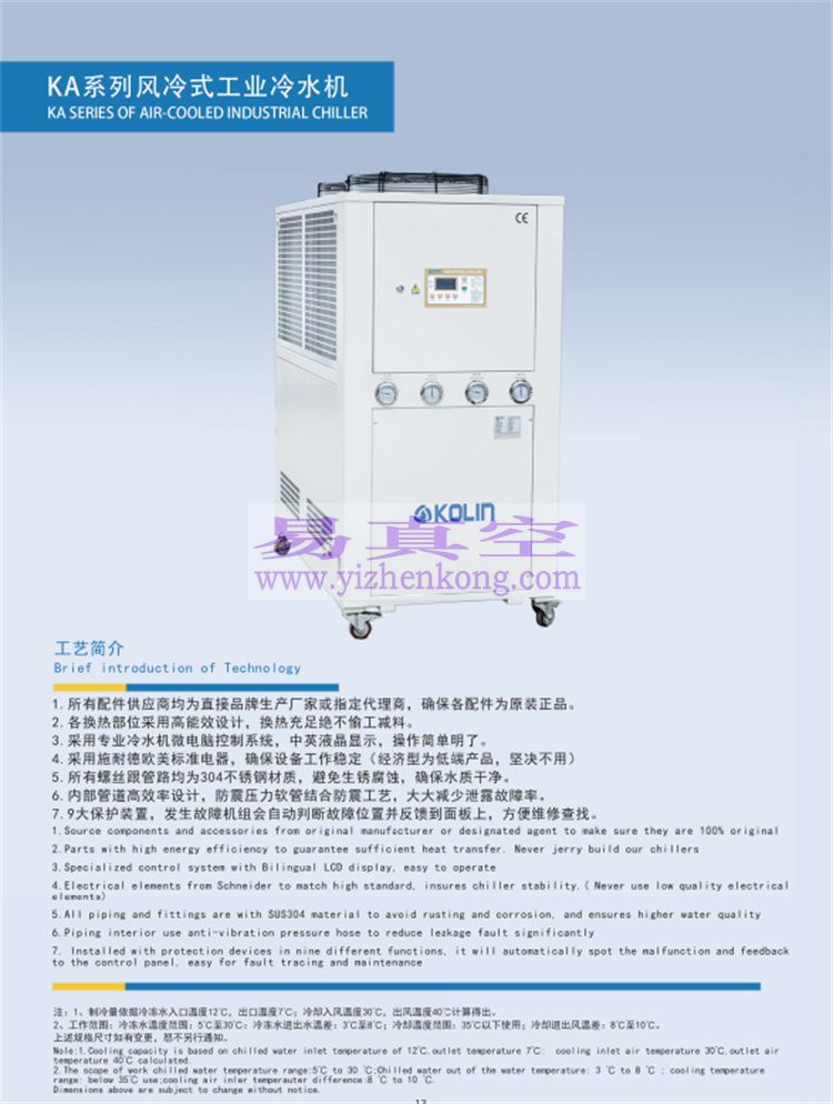 RA系列风冷式工业冷水机广泛应用于塑胶、电子制造、电镀、、化工、超声波冷却、印刷、真空镀膜等工业生产,它能精确控制现代工业机械化生产所要求温度,从而大大提高了生产效率及产品质量。科凌工业冷水机操作简便、设计合理、品质**,规格齐全,是现代化工业生产**缺少的得力助手。