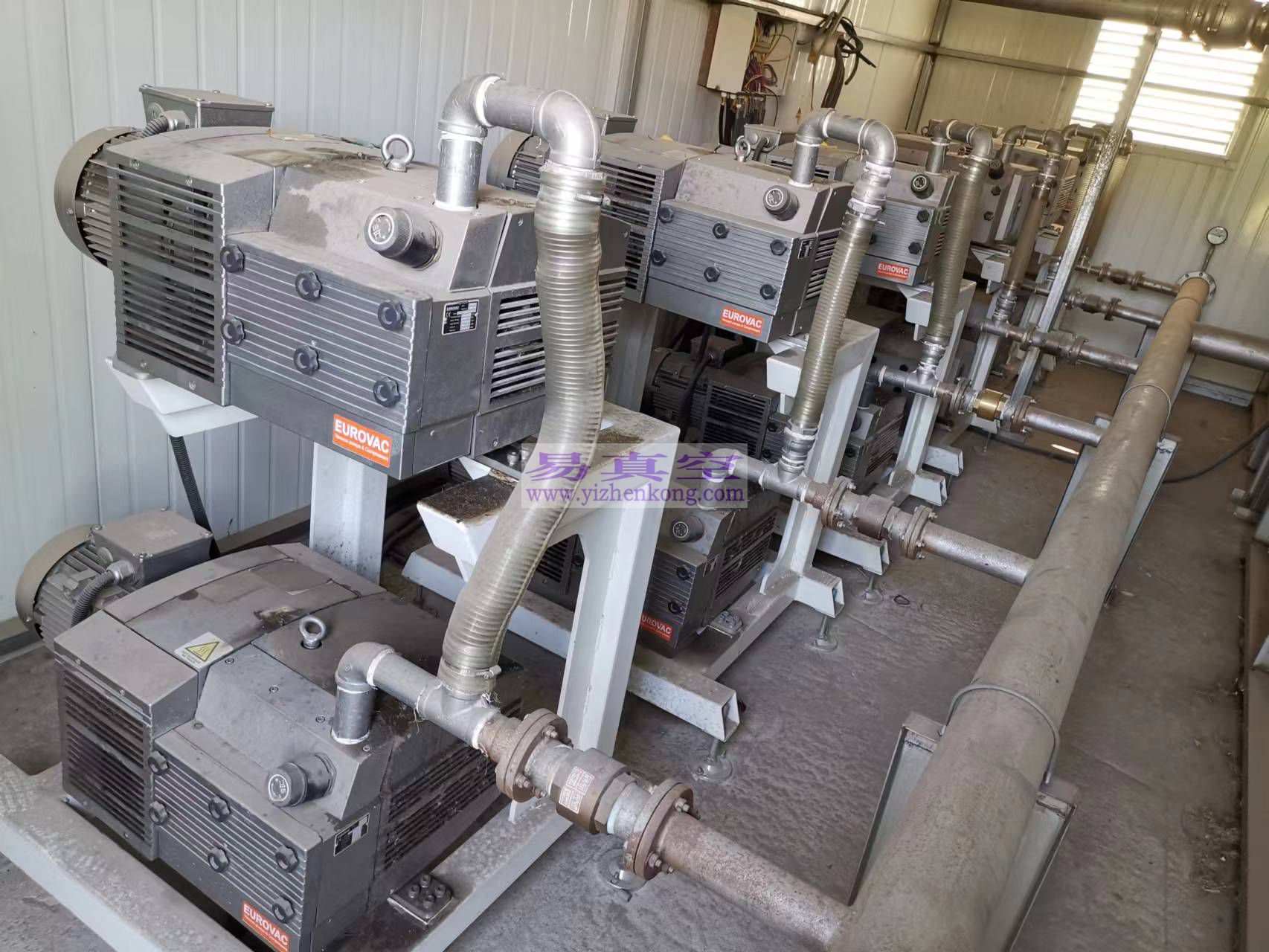 1、现状是6台木工切割机床,共同用一个真空气站,真空气站共用12台无油旋片真空泵。