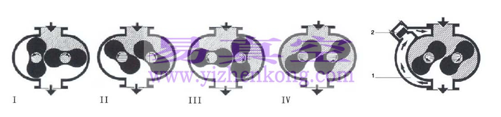 当转子位于腔室的1和2位置时,进气口的体积增大。当转子在腔室中位于3时,部分风量将从进风口被阻挡。当转子位于4时,这个体积将打开以排气。当转子进一步转动时,空气将通过出风口排出。转子每旋转一次,将旋转两圈以上。