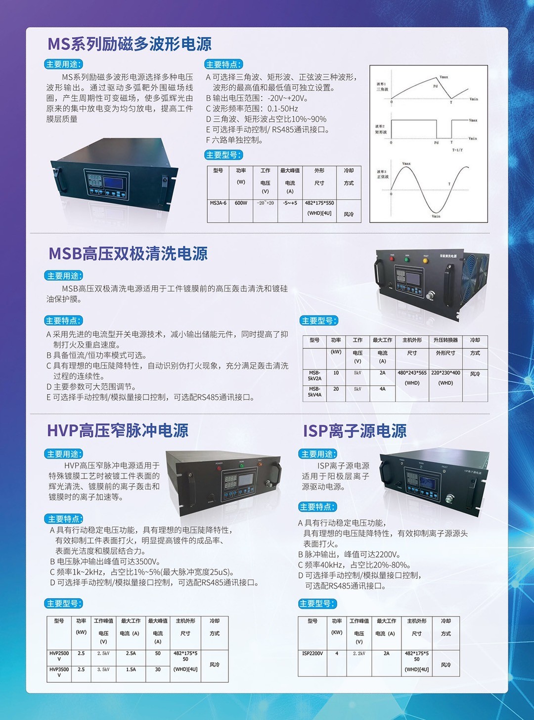 多波形励磁电源、高压窄脉冲电源、双极清洗电源、离子源电源、直流磁控电源、脉冲磁控电源、中频电源、脉冲偏压电源、直流偏压电源